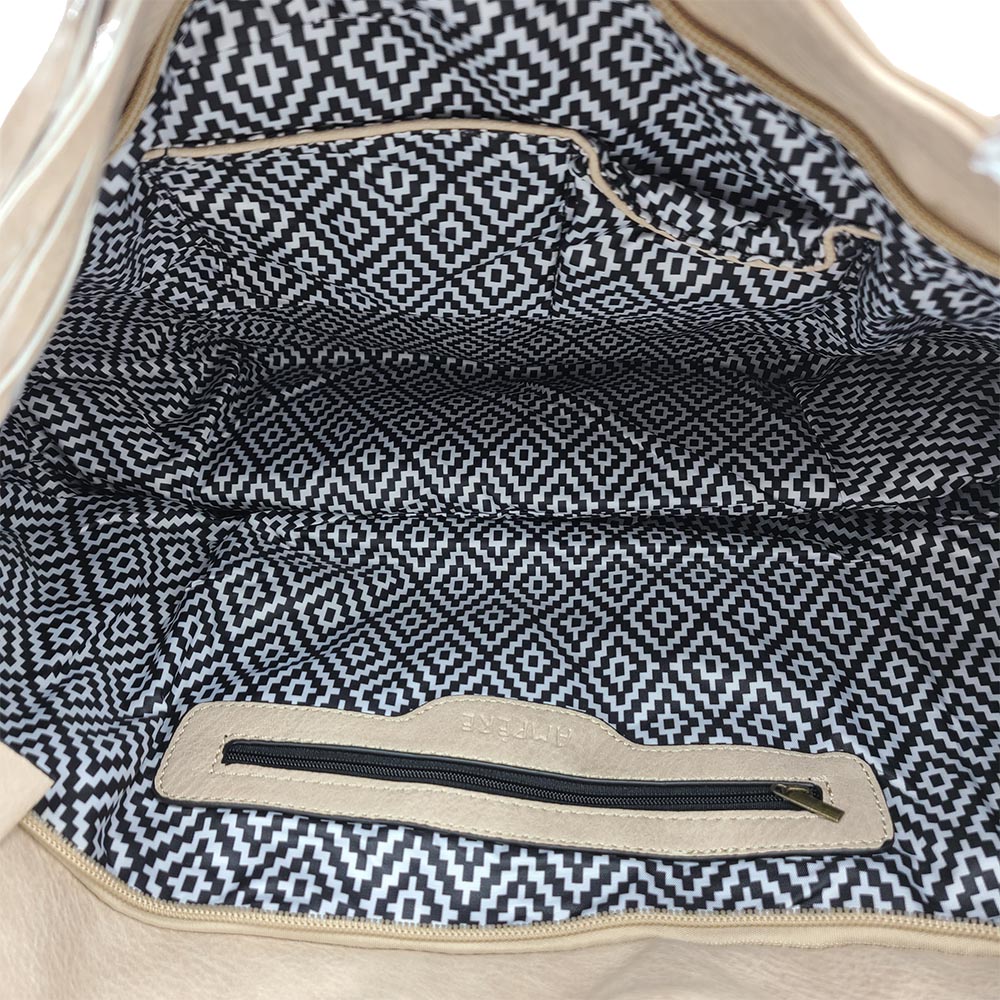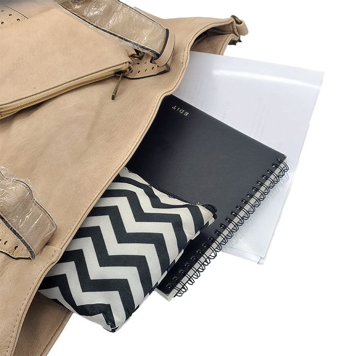 広々としたシングルコンパートメントの中には、2つのフロントウォールポケットとバックウォールジッパーポケット。裏にもジッパー付きポケットがあります。