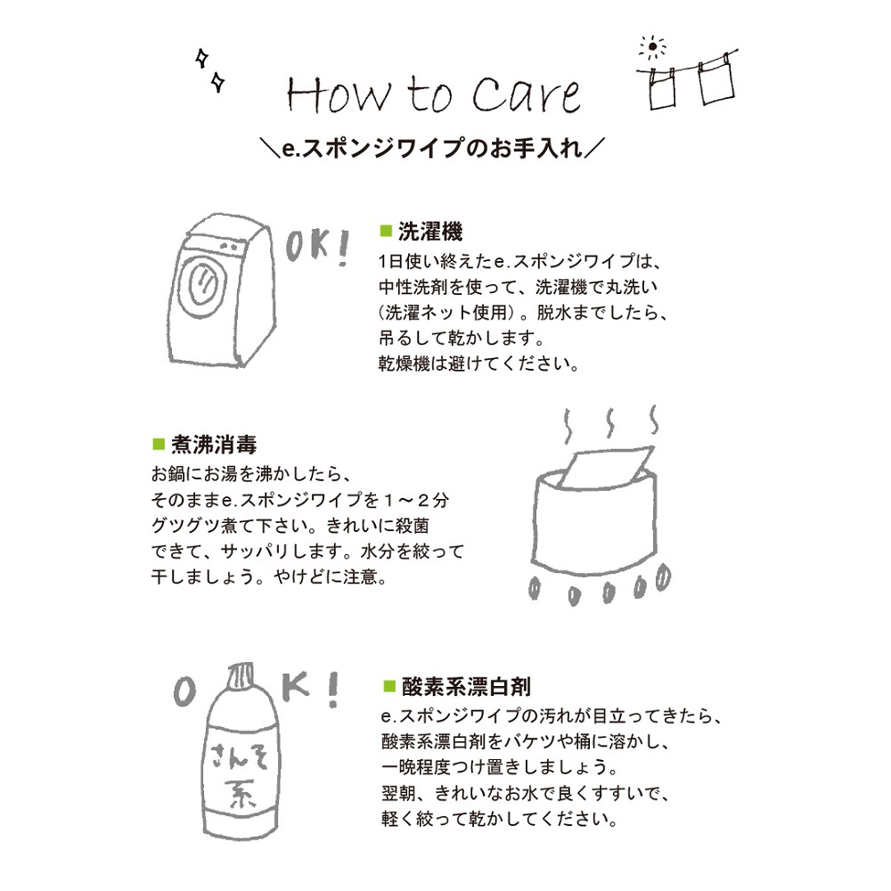 1日使ったあとは、洗濯ネットに入れて洗濯機で洗って乾かしてください。乾燥機はおやめください。週に1度、酸素系漂白剤でつけ置き洗いをして頂くと、長く清潔にお使いいただけます。(塩素系漂白剤は生地を傷めます)